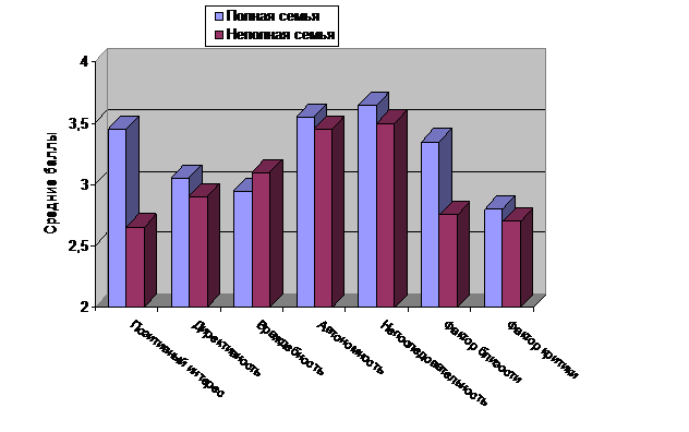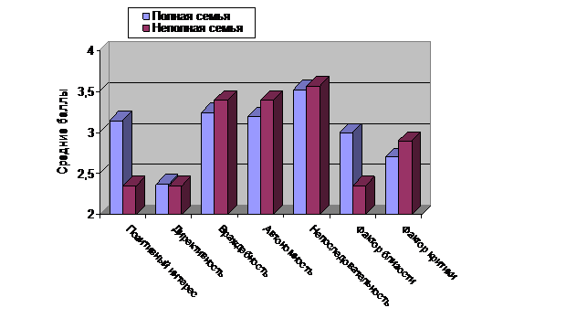 Рисунок 1. Родительские установки и тактика воспитания матери как это видят подростки (в зависимости от пола респондента). Респонденты из полных семей, что естественно, в большей степени, чем из неполных считают, что их отцы проявляют в отношениях к ним позитивный интерес (U=377,4; p<0,05), то есть считают, что отцы стремятся достигнуть с ними понимания, не прибегая к декларированию догм, стремятся к теплым дружеским отношениям с четким осознанием границ того, что можно и чего нельзя. Фактор близости с отцом в полных семьях по мнению наших респондентов выше (U=422,5; p<0,05), чем в неполных семьях. То есть респонденты из полных семей в большей степени, чем из неполных считают, что отцы их принимают и в большей степени проявляют теплые чувства. Рисунок 2.