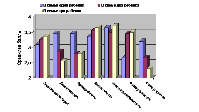 Рисунок 3. Родительские установки и тактика воспитания матери как это видят подростки (в зависимости от типа семьи). Количество детей в семье оказывает существенное влияние на то, как дети оценивают родительские установки и воспитательный стиль своей матери. Как показано на Рисунке 4, респонденты из семей, где один ребенок в большей степени считают свою мать директивной (Н=9.6, р<0.001), чем респонденты из семей, где 2 ребенка. У респондентов из семей, где 3 ребенка и больше считают свою мать в меньшей степени директивной, чем респонденты из однодетных и двухдетных семей. Как следствие высокой директивности, аналогичная закономерность прослеживается и при рассмотрении фактора критики со стороны матери - матери из однодетных семей по мнению наших респондентов в большей степени склонны к проявлению тотального контроля и высокой степени заинтересованности в своем ребенке(Н=9.24, р<0.05), чем матери в двухдетных семьях.