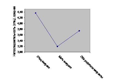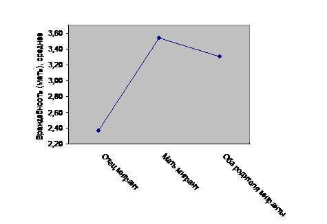 респондентов второго поколения мигрантов (F=3.03, p<0.05). На Рисунке 8 показано, что мигранты второго поколения из семей, где только мать является